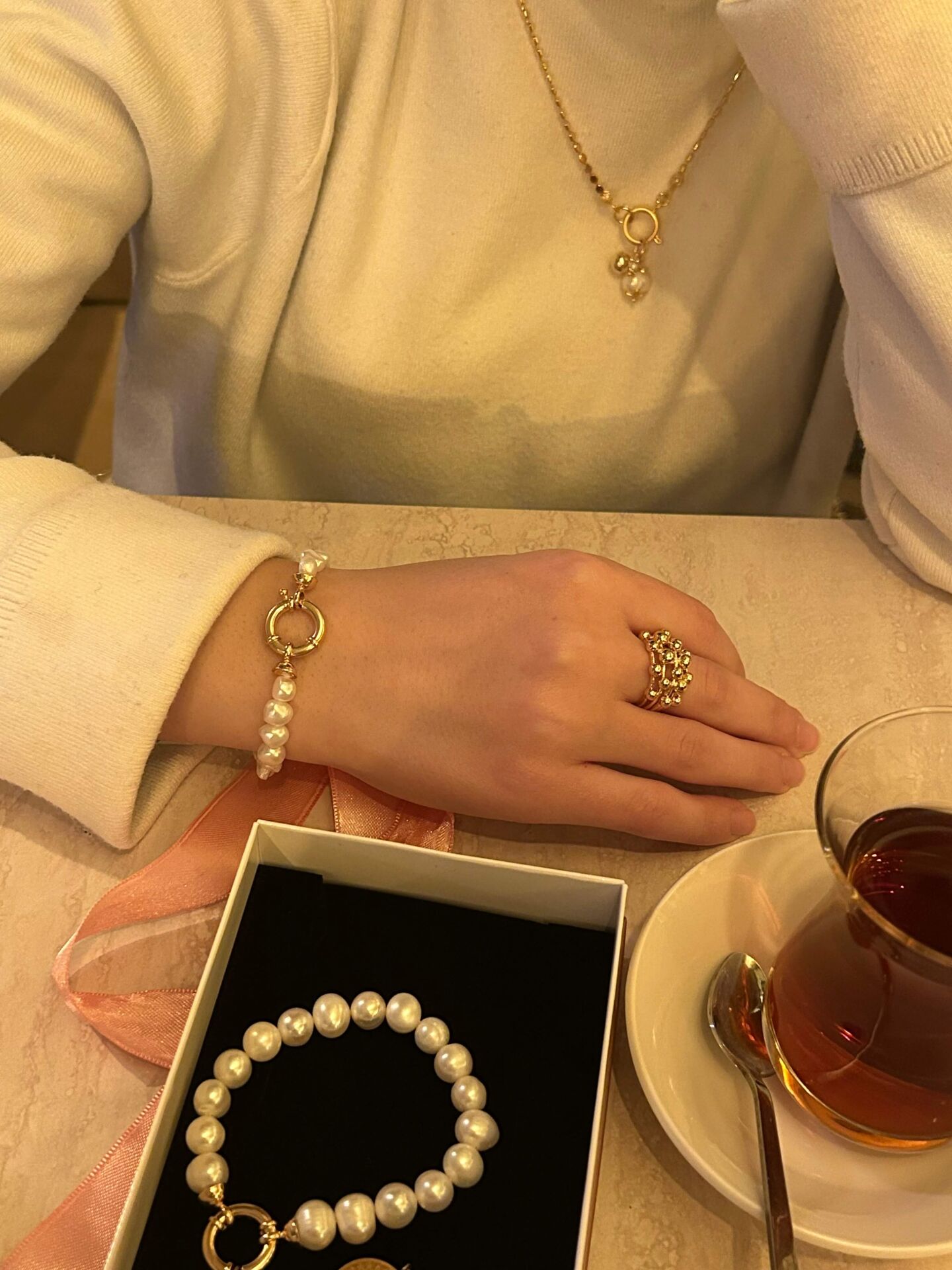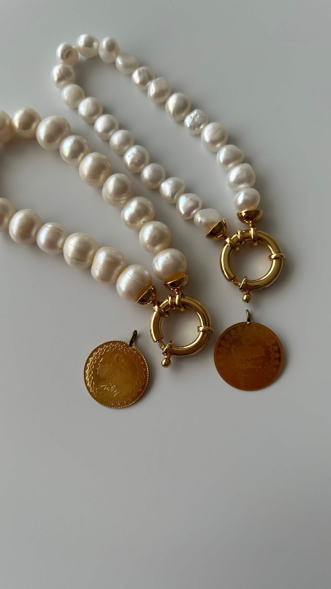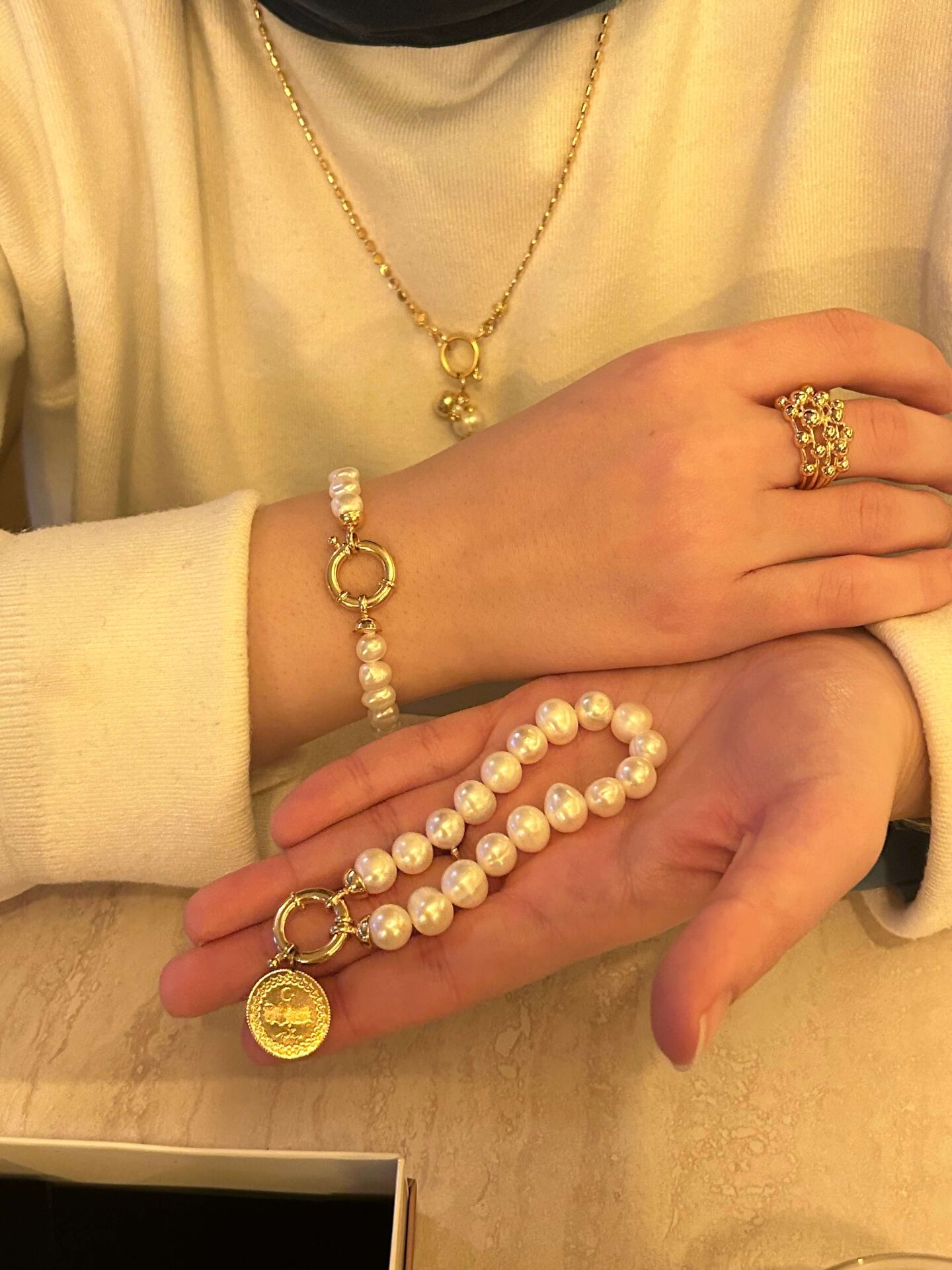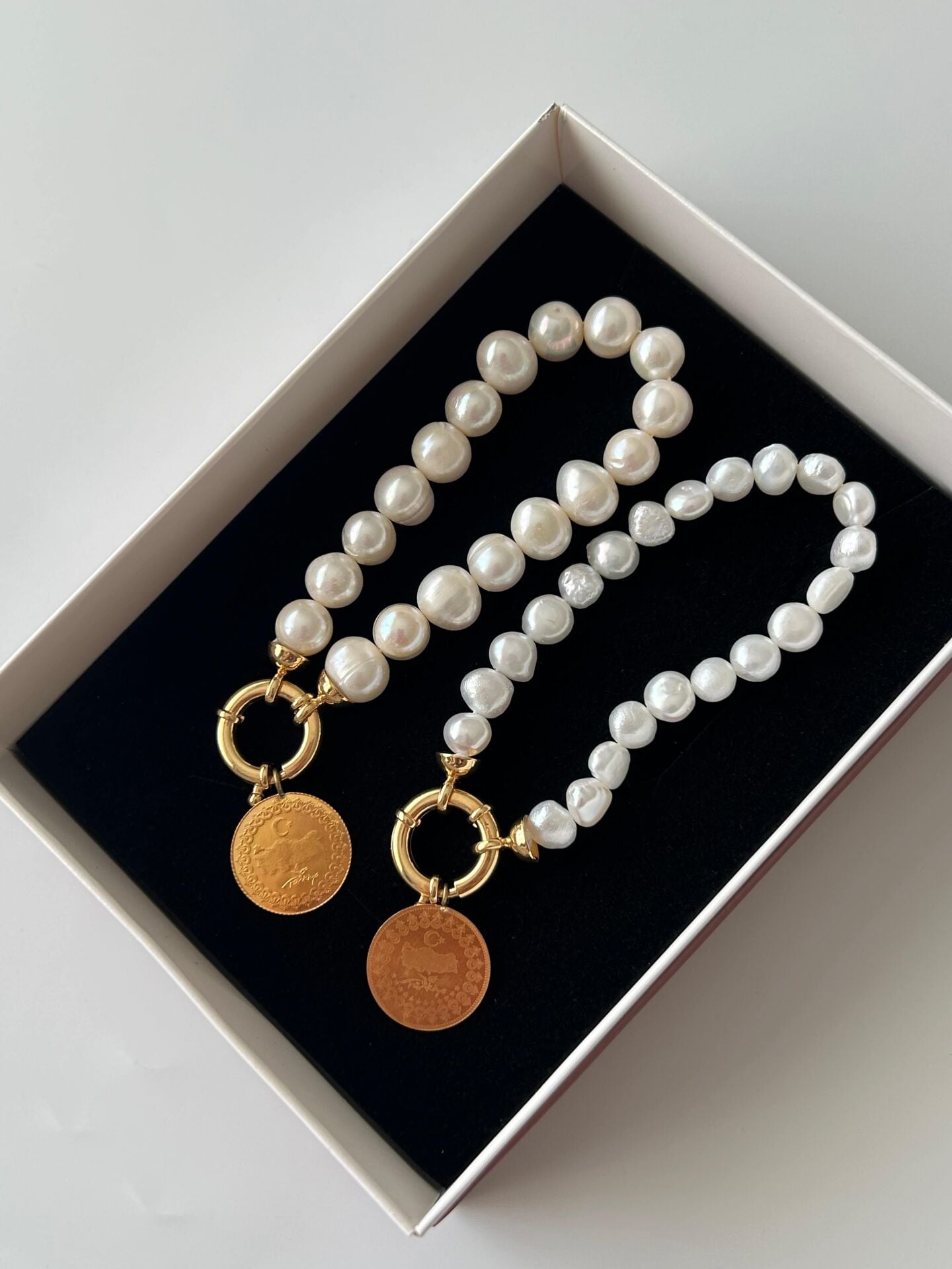 Ürünümüzde bulunan aparat materyali 925 ayar gümüş üzeri altın kaplama olup doğal inciden oluşur.Ürünümüz doğal inciden oluştuğu için boyut ve formlarında minik farklılıklar olabilir.Uzunluğu yaklaşık 15 cm + 2,5 cm aparat uzunluğu vardır.Dilediğiniz uzunluğu sipariş notunda belirtebilirsiniz.