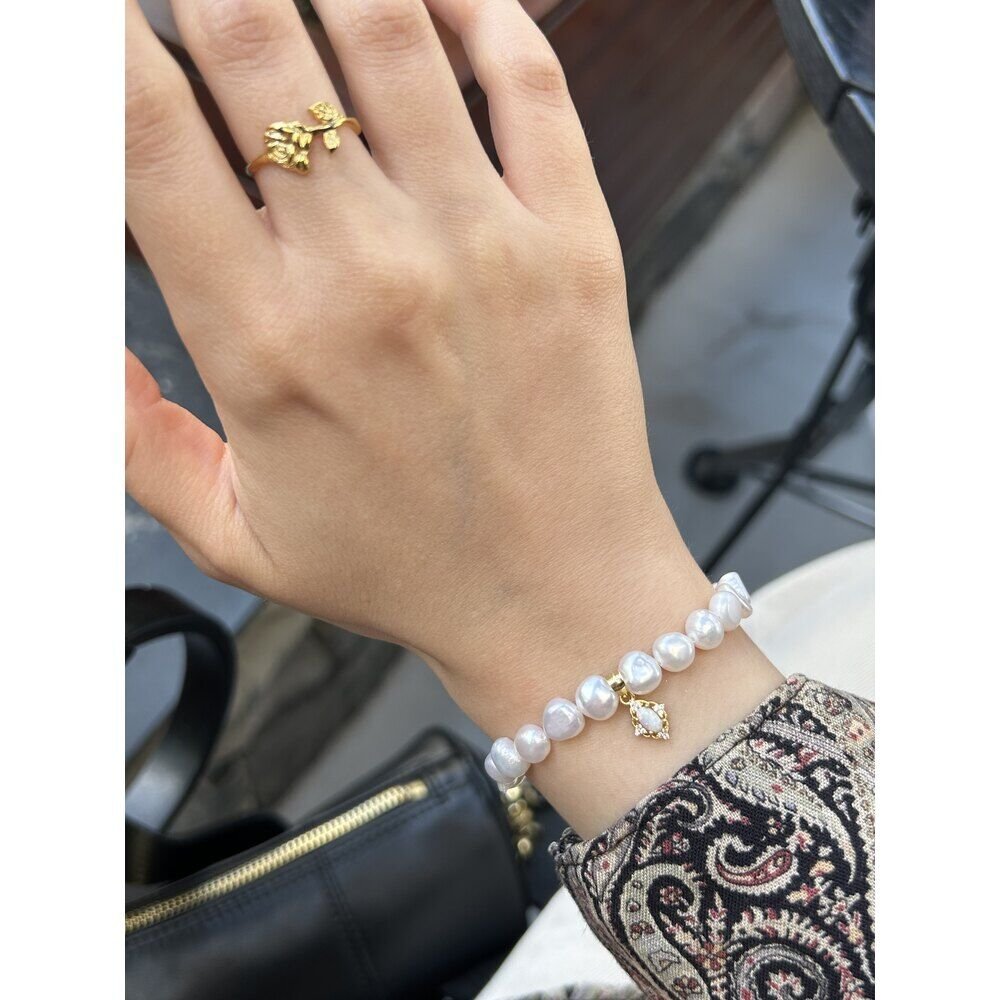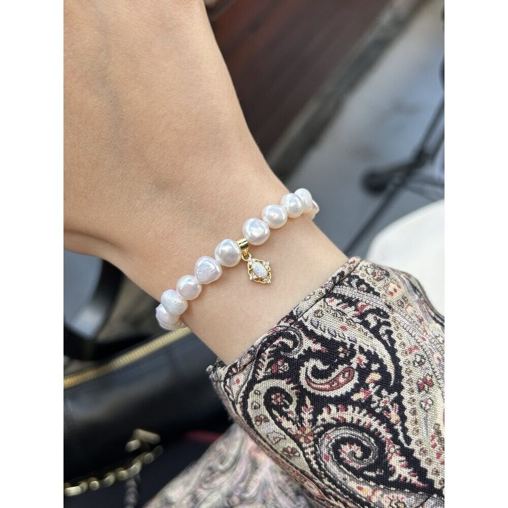 Ürünümüzde bulunan aparatlar pirinç üzeri altın kaplama olup doğal inciden oluşur.Ürünümüz doğal inciden oluştuğu için boyut ve formlarında minik farklılıklar olabilir.Uzunluğu yaklaşık 16 cm + 3 cm uzatma zinciri vardır.Dilediğiniz uzunluğu sipariş notunda belirtebilirsiniz.Üründe bulunan opal doğaltaş charm materyali 925 ayar gümüş üzeri 14 ayar altın kaplamadır.