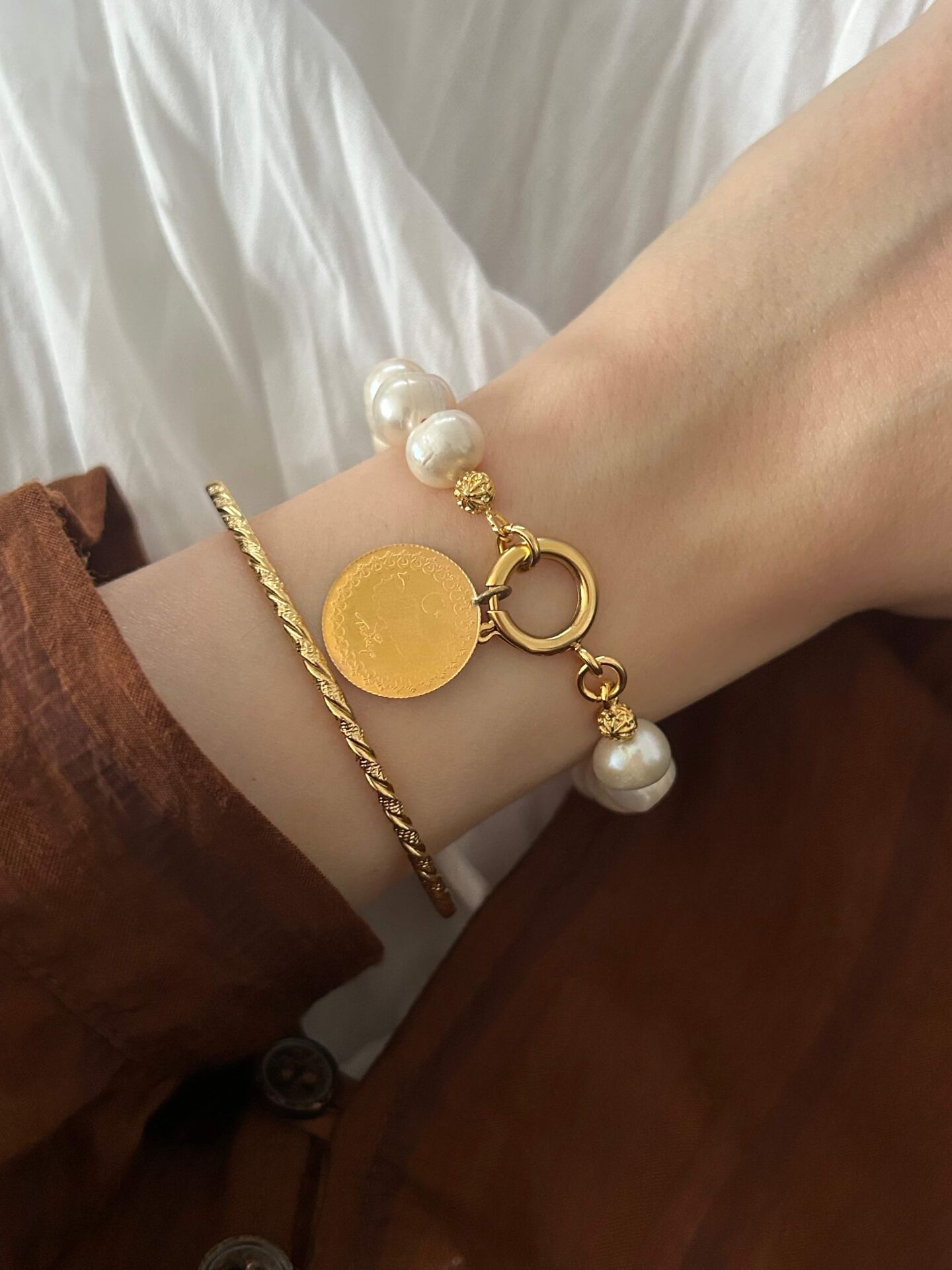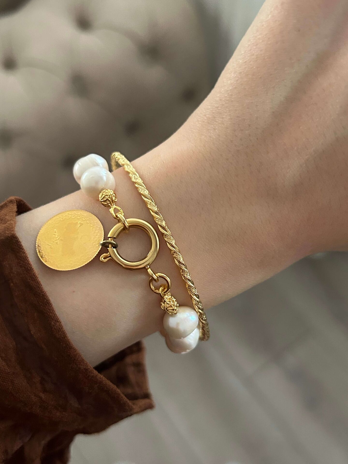 Ürünümüz pirinç üzeri altın kaplama olup doğal inciden oluşur.Ürünümüz doğal inciden oluştuğu için inci boyut ve formlarında minik farklılıklar olabilir.Çapı yaklaşık 6 cm’dir.