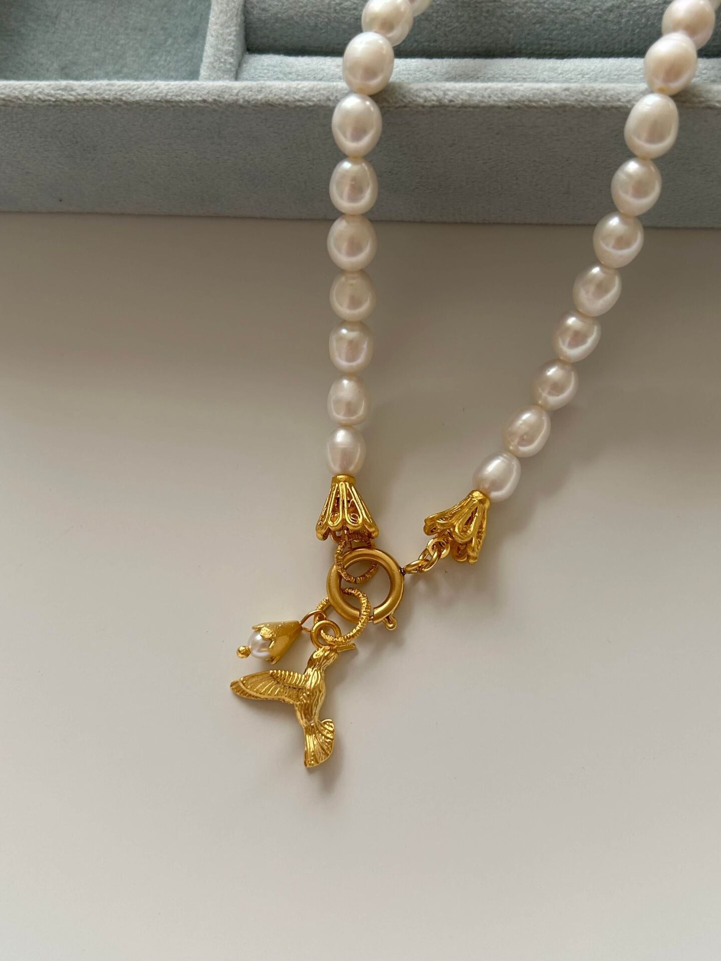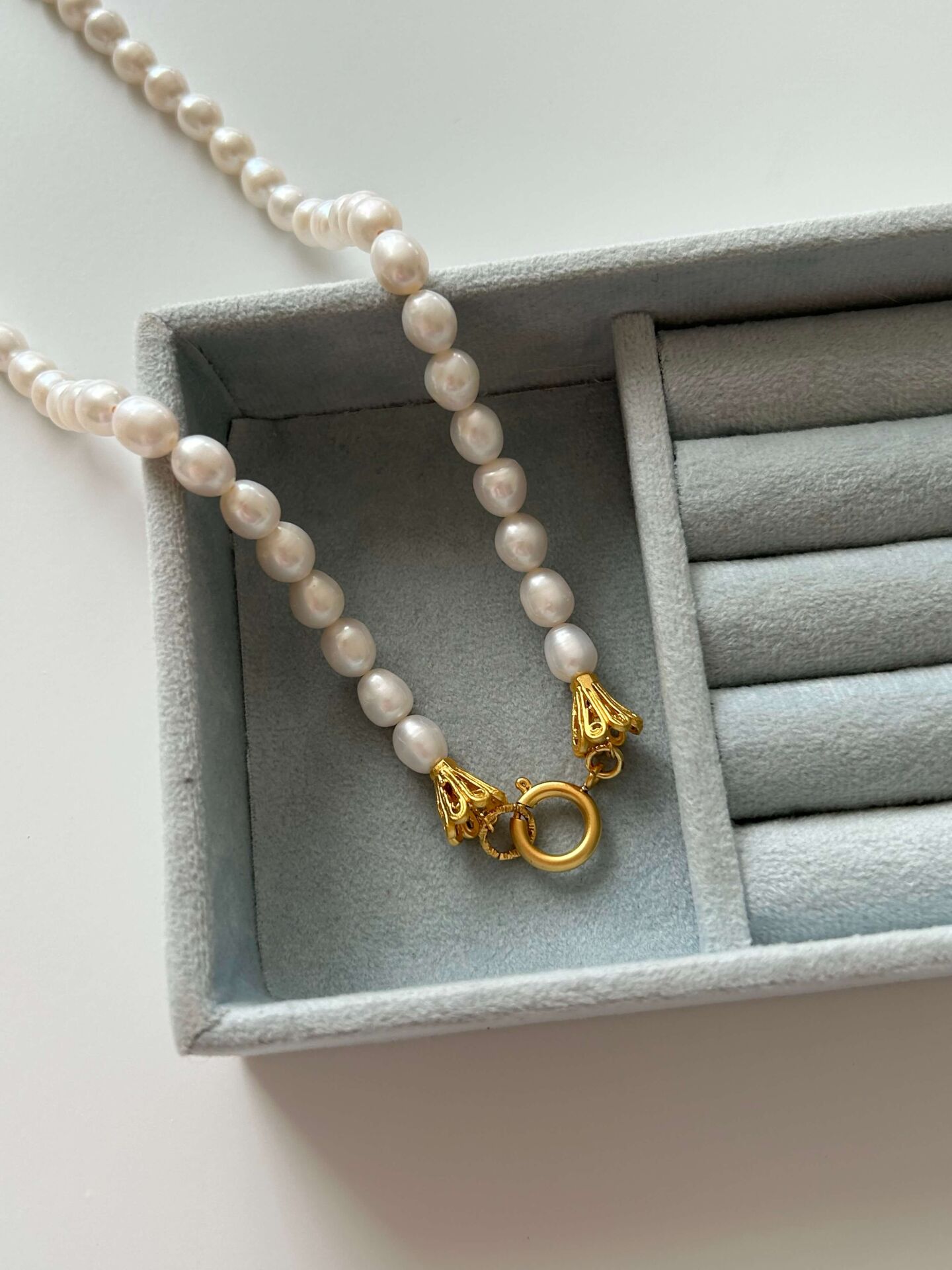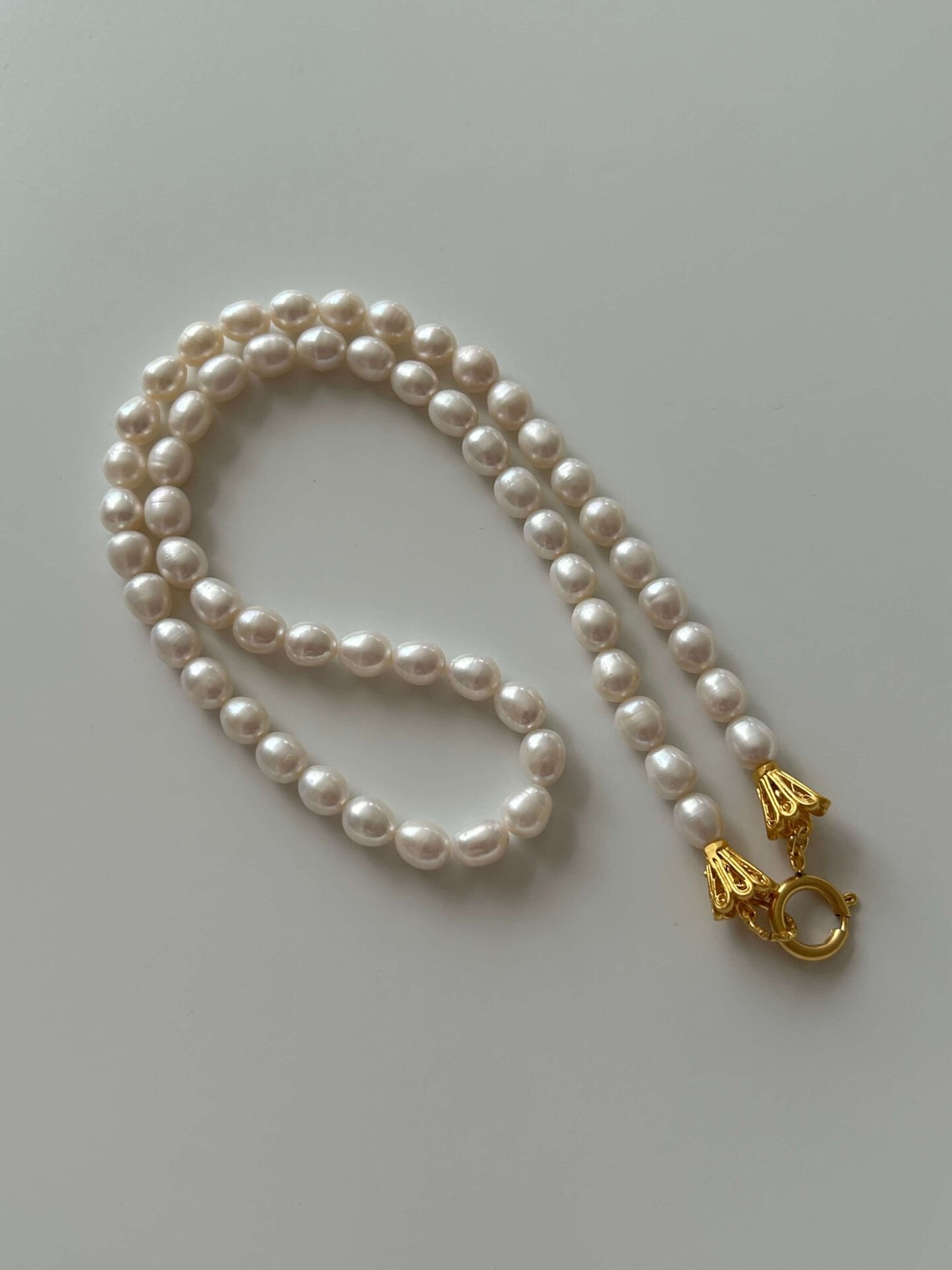 Ürünümüzde bulunan aparatlar pirinç üzeri altın kaplama olup doğal inciden oluşur.Ürünümüz doğal inciden oluştuğu için boyut ve formlarında minik farklılıklar olabilir.Uzunluğu toplam yaklaşık 45-46 cmdir.
