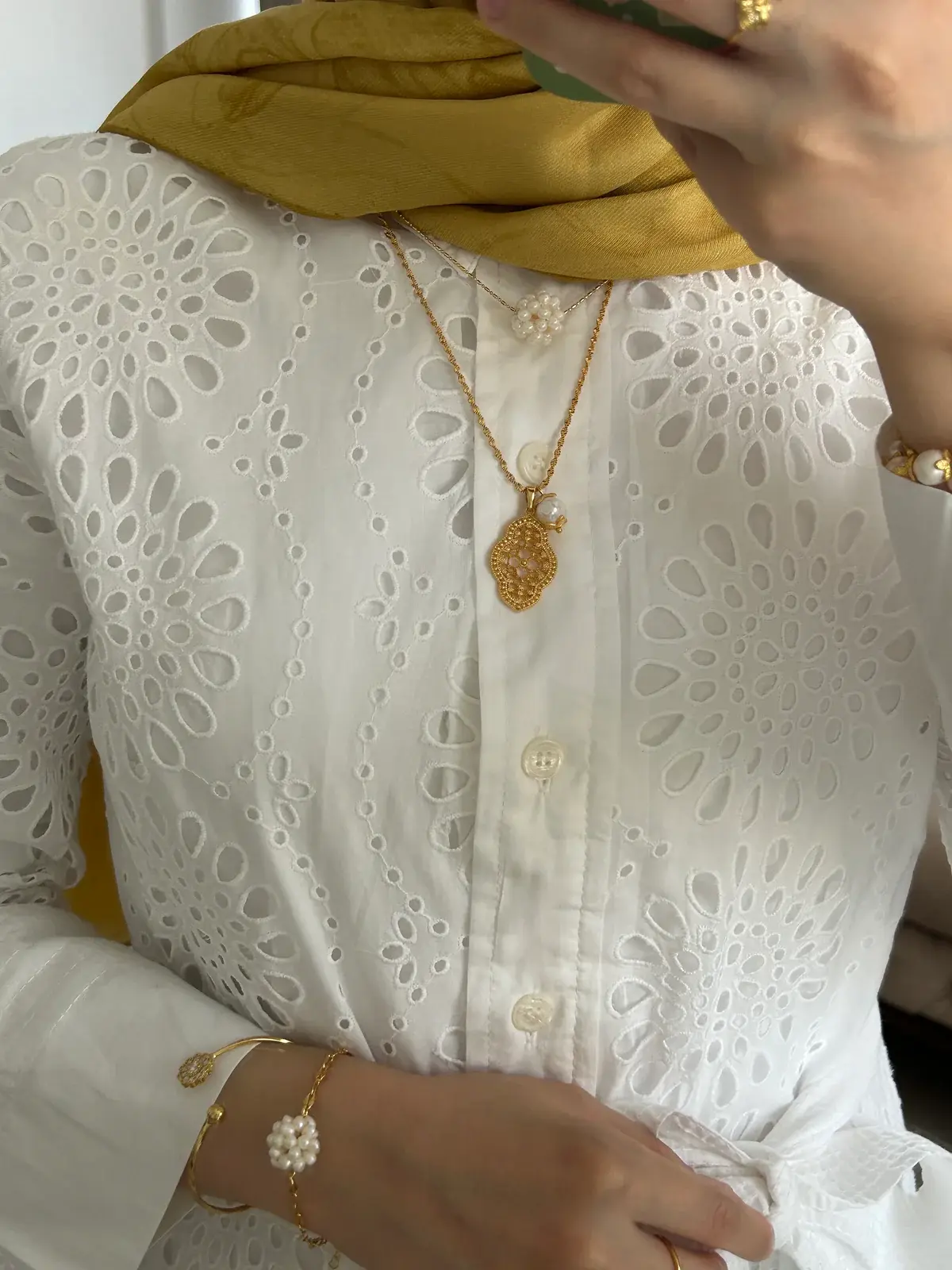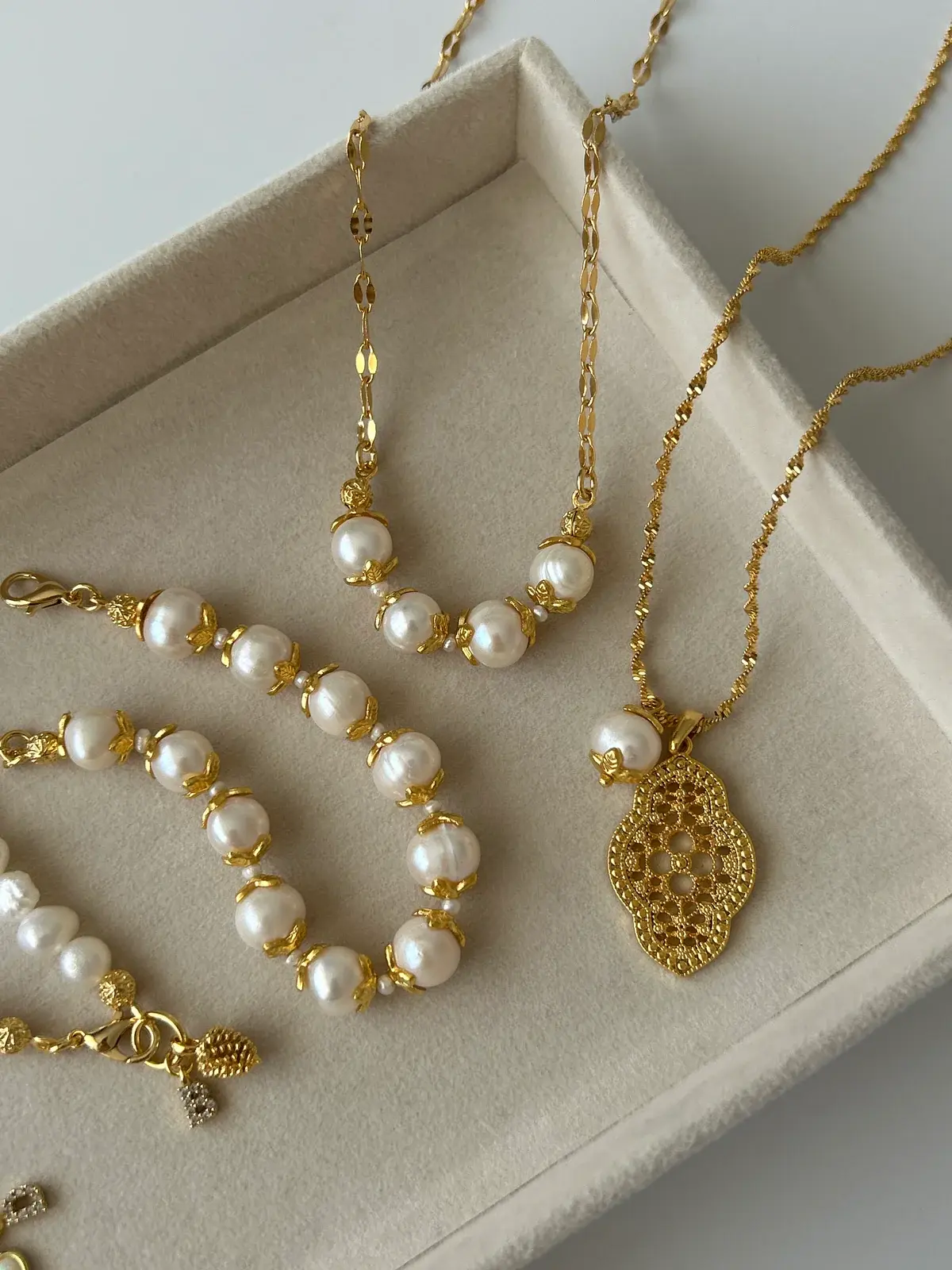 Ürünümüz pirinç üzeri altın kaplama olup doğal inciden oluşur.Ürünümüz doğal inciden oluştuğu için boyut ve formlarında minik farklılıklar olabilir.Uzunluğu 50 cm + 3 cm uzatma zinciri vardır.